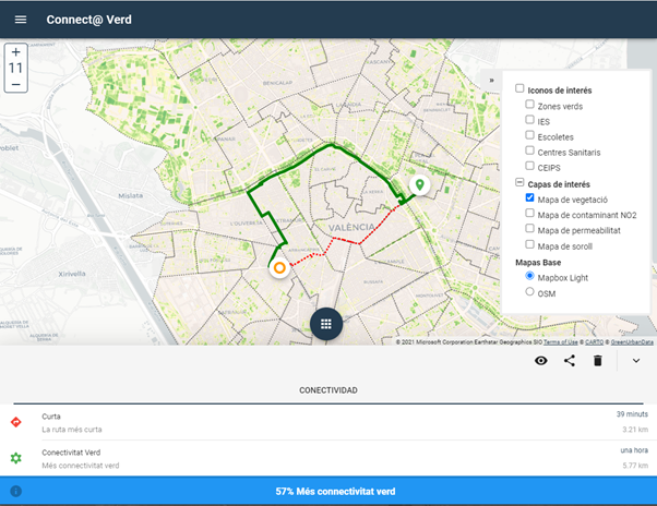 La plataforma combina mapas de vegetación, ruido, permeabilidad del suelo, calidad del aire y otros datos urbanos, y calcula de forma automática el trazado con mayor potencial de conectividad verde entre dos puntos según criterios ambientales y sociales.