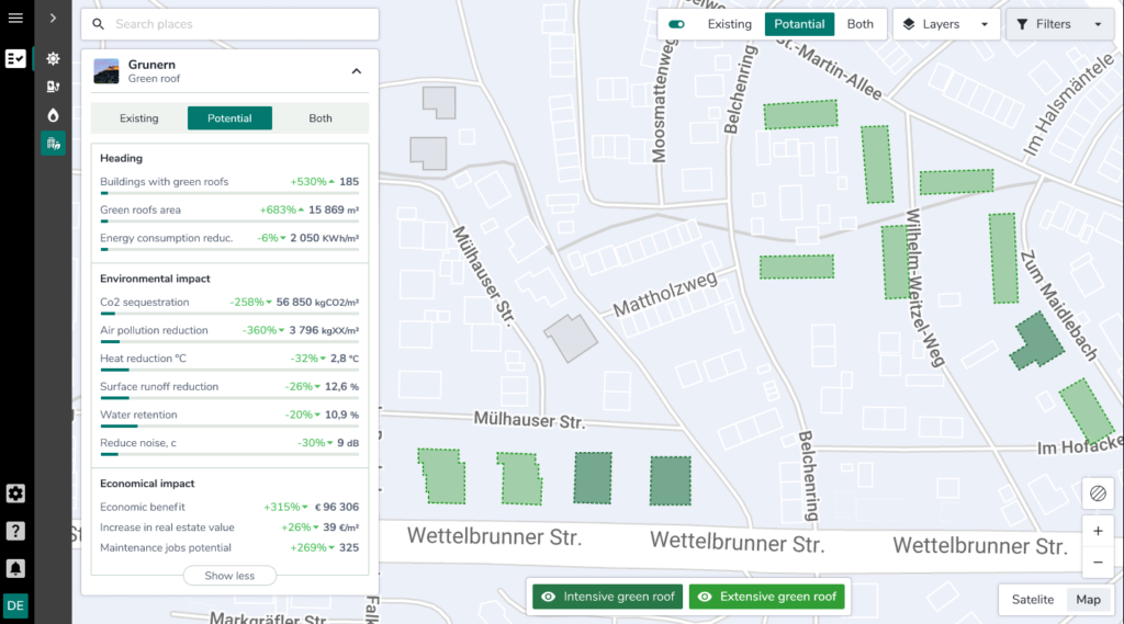 El proyecto, desarrollado por Green Urban Data (España) y Greenventory (Alemania), se centra en la planificación y seguimiento climático en ciudades mediante un servicio para la detección automática de cubiertas de edificios y la evaluación de su potencial de adaptación, tanto para usos energéticos como para cubiertas verdes, constituyendo un piloto pionero en cubiertas Bio Solares (Biosolar Roofs).